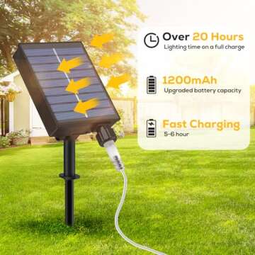 Thanks to its high-quality solar power technology, you can enjoy energy savings while decorating your space. The built-in 1200mAh rechargeable battery charges during the day and allows for an impressive 20 hours of runtime when fully charged, automatically turning on at dusk. Note: do not remove the protective film on the solar panel to prevent reducing its lifespan.
