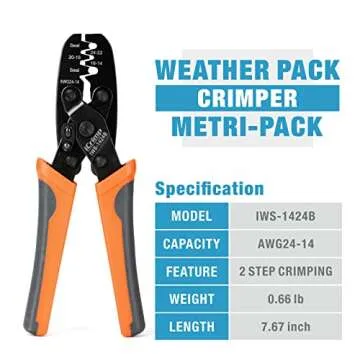 Show moreIntroducing the iCrimp Weather Pack Crimper Tool—the ultimate solution for DIY automotive enthusiasts and professionals alike looking to achieve high-quality crimp connections with Delphi APTIV and Metri-Pack terminals. This innovative tool is not just versatile but also engineered to deliver precision crimping for a variety of applications, ensuring that your projects maintain the both integrity and reliability that OEM components provide. Whether you're replacing damaged connectors or adding custom wiring, the IWS-1424B model ensures you do so with ease and efficiency.