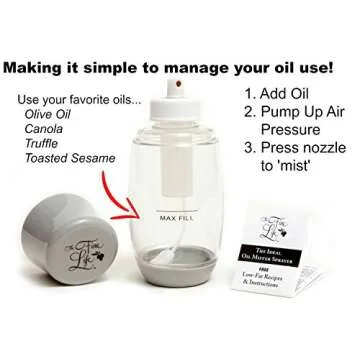 Show more Introducing the Ideal Olive Oil Sprayer Mister from The Fine Life—the perfect companion for health-conscious cooking enthusiasts! This innovative air pressure system revolutionizes the way you use oil, allowing for precise control over every spritz. Whether you're on a paleo diet, practicing HCG, or simply love adding flavor to your meals, this mister empowers you to manage your caloric intake without sacrificing taste. Now you can enhance your favorite dishes with just the right amount of olive oil, vinegar, lemon juice, or sesame oil, all while eliminating the need for chemical propellants and wasteful oil pouring!