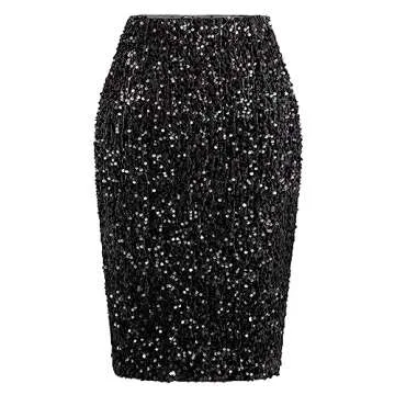 Show more Step into the spotlight with the IDEALSANXUN Black Skirt, a must-have addition to your wardrobe for the 2023 fashion season. Crafted with high-quality materials, this trendy skirt features a striking design that showcases your figure while allowing for comfortable movement. The high waisted pencil style is ideal for accentuating your waist, while the bodycon fit ensures you look effortlessly chic. Adorned with sparkly glitter that glimmers under the light, this knee-length midi skirt offers a perfect blend of elegance and flair.
