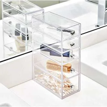 Show moreIntroducing the iDesign Clarity Plastic Cosmetic 5-Drawer Organizer, a multifunctional solution meticulously crafted to simplify your life and enhance your space. This stylish organizer measures 3.25" x 7" x 9.75" and is made from durable, transparent plastic, which allows you to view your items at a glance while keeping them protected. Elegantly designed with chrome knobs, it adds a chic touch to your vanity, bathroom shelf, or office desk.