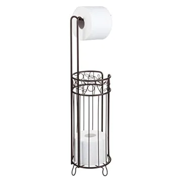 Show more Transform your bathroom into a beautifully organized haven with the iDesign Metal Toilet Paper Holder. This stylish and functional accessory from the esteemed Twigz Collection is designed to hold up to four rolls of toilet paper, ensuring that you never run out at inconvenient moments. Crafted with high-quality steel, its bronze finish not only promises durability but also enhances the aesthetic appeal of any bathroom decor. With dimensions of 7" x 7" x 25", this freestanding holder seamlessly fits in compact spaces, be it next to your toilet or tucked away in a closet.