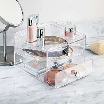 Show moreIntroducing the iDesign Plastic 2 Jewelry Box, the ultimate compact storage solution that seamlessly blends functionality with style. This elegant box is designed to elevate your organization game while complementing any décor. Measuring a convenient 6.5" x 7" x 5", it's perfect for tight spaces, making it an essential addition to your vanity, dresser, bathroom, craft room, or office. With two separate sliding drawers, you can easily store and access all your smaller items, from makeup and hair supplies to office essentials and jewelry. Its classic clear plastic design paired with stylish chrome knobs ensures that this storage box not only serves a practical purpose but also enhances the aesthetic of your space.