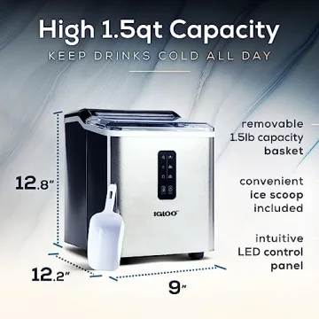 Show more Introducing the Igloo Automatic Ice Maker, a must-have appliance for any ice lover! This sleek and compact countertop ice maker is designed to fit effortlessly into your kitchen, bar, or outdoor space while delivering a high ice yield of up to 26 pounds in just 24 hours. Perfect for parties, gatherings, or simply to keep your favorite beverages refreshingly cool, this ice maker ensures that ice is always at your fingertips. With its user-friendly LED control panel, you can easily monitor ice levels and production status, making it a convenient addition to your home.