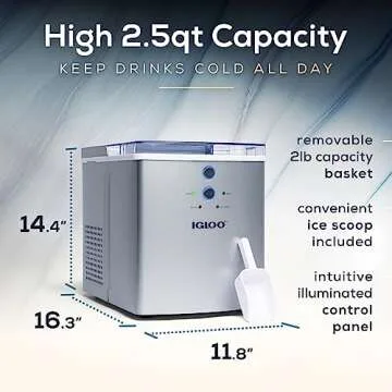 Show moreIntroducing the **Igloo Electric Countertop Ice Maker Machine**, a versatile and powerful addition to your kitchen designed with your convenience in mind. This automatic and portable ice maker has a sleek silver finish that effortlessly complements any countertop decor. With the ability to produce an impressive **33 pounds of ice** in just **24 hours**, this machine is perfect for those who love entertaining or simply need a steady supply of ice for their daily beverages. The **2.5-quart water tank** ensures that you can keep the drinks flowing without constant refills, and its spacious ice basket can store up to **2 pounds of freshly made ice** at a time.