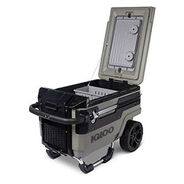 Show moreIntroducing the ultimate outdoor companion that redefines what a cooler can do! This innovative cooler is equipped with oversized wheels for superior traction, enabling you to tackle even the toughest terrains effortlessly. The smooth-ride wheels measure a phenomenal 10 inches that ensure you can glide over sand, grass, or rocks without breaking a sweat. Whether it’s a beach day or a camping adventure, this cooler is built to impress!