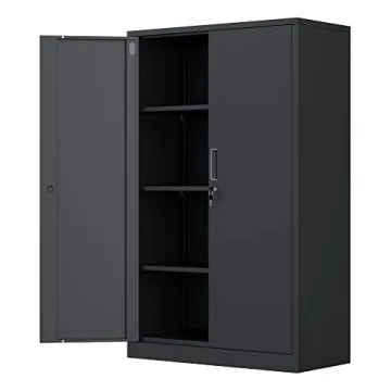 Show more Upgrade your organizational game with the iJINGUR Metal Storage Cabinet with Locking Doors. Designed to be both stylish and functional, this 53.5-inch tall lockable steel storage cabinet offers a secure storage solution for your home or workspace. With a robust locking mechanism and four keys included, you can store your valuable items with complete peace of mind. Its sleek black finish ensures it fits seamlessly into any décor, whether it's a modern home office, a bustling garage, or a tidy pantry.