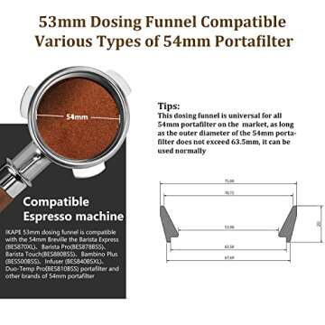 Show more The IKAPE Espresso Dosing Funnel is a revolutionary tool for coffee enthusiasts, particularly those who own 54mm Breville portafilters. This funnel is artfully designed to ensure that all coffee grounds are directed precisely into the portafilter basket, leaving no room for mess or waste. Imagine a workspace that is solely dedicated to your coffee passion, clean and organized with the help of this thoughtful accessory. Made from high-quality food-grade 304 stainless steel, this funnel not only promises durability but also guarantees safety for your family. You can trust that it will neither rust nor corrode, making it a long-lasting addition to your coffee-making arsenal.