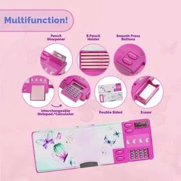 The ikkshaa Pop Up Butterfly Pencil Case redefines school supplies with its multiple compartments for pencils, sharpeners, erasers, rulers, paper clips, and even a functional calculator. Everything is organized effortlessly, allowing kids to focus on learning rather than searching for their essentials. The sturdy plastic construction with a strong magnetic closure keeps all components secure, so parents can trust their child's supplies are safe.