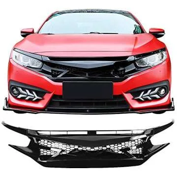 IKON MOTORSPORTS Grille Compatible With 2016-2021 Honda Civic, IKON Style Gloss Black Front Bumper Grille Hood Grill With Eyelids 3PC ABS
