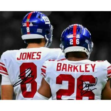 Show moreIntroducing the Daniel Jones Saquon Barkley Signed Photo Autograph Print Wall Art Home Decor, a unique and exclusive item that is a must-have for any sports enthusiast or New York Giants fan. This magnificent wall art features the autographs of two of the most prolific athletes in the NFL today—Daniel Jones and Saquon Barkley. The high-quality print brings their dynamic presence to life, making it a standout addition to any room. Perfectly blending artistic value with sentimental attachment, this piece is not just decoration but a token of admiration for the sport and its players. With expert framing and pristine print quality, this product is designed to be a cherished keepsake for years to come.