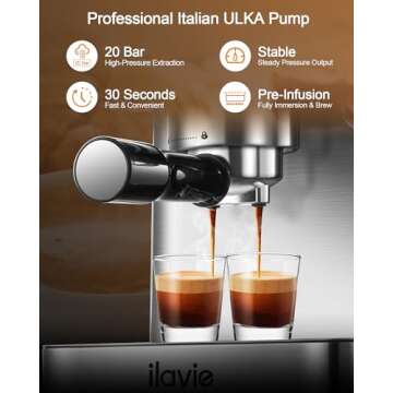 Show moreIntroducing the ILAVIE Espresso Machine 20 Bar, the perfect blend of professional performance and home convenience. This elegant stainless steel espresso maker allows you to indulge in rich crema and full flavor espresso, featuring a robust 20 bar pump pressure system that expertly balances flavor extraction and crema formation. Experience café-quality espresso in the comfort of your own kitchen, ensuring that every cup is crafted to perfection.