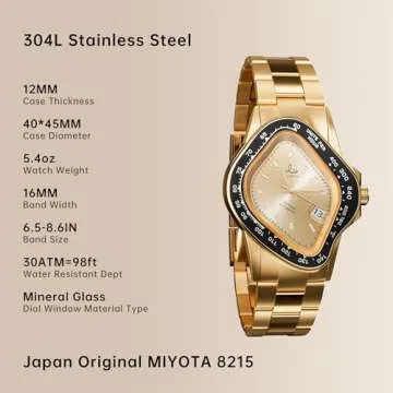 The main feature is the Miyota 8215 automatic movement, which offers precise timekeeping without the need for batteries.