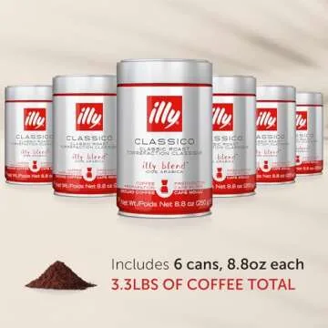 Show moreIntroducing the illy Ground Drip Coffee - 100% Arabica – Classico Medium Roast, your new favorite indulgence every morning! Crafted specially for drip coffee machines, this luxurious coffee comes in six sleek canisters, each containing 8.8 ounces of flavorful medium roast. In total, you'll enjoy a generous 52.8 ounces of coffee, all sealed with precision to maximize freshness. The unique nitrogen-packed packaging ensures every sip delivers the fresh, aromatic experience you expect from premium coffee. Enjoy distinctive flavor notes of caramel, orange blossom, and jasmine that create a delightful coffee experience unlike any other.