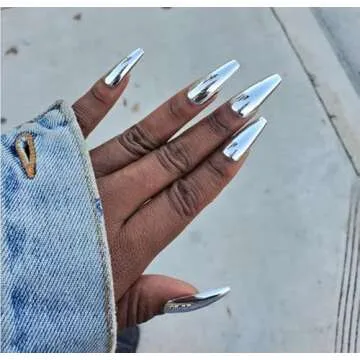 iMABC Silver Punk Metallic Press On False Nails Long Coffin Ballerina Chrome Mirror Fake Nails Full Cover Acrylic Nail Tips with Glue Tape For Women And Girls