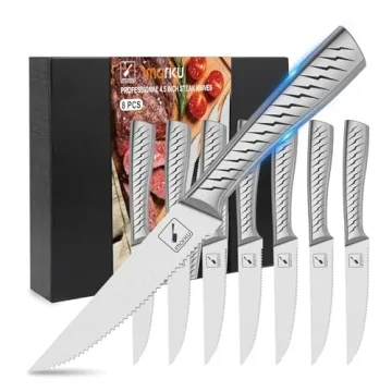 Pioneering a blend of elegance and functionality, the imarku steak knives set revolutionizes your dining experience. Crafted from high carbon stainless steel, these knives are not only tarnish-resistant but also rust-resistant, ensuring longevity and quality with every cut. Each knife showcases a special serrated edge design and boasts a full-tang blade, promoting precise cutting with remarkable sharpness, stability, and balance. Impressive aesthetics accompany functionality, as the distinctive lightning...