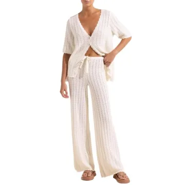 Stay chic and stylish with our exquisite 2-piece crochet swimsuit cover-up set, the perfect addition to your summer wardrobe. This product showcases a fashionable hollow-out knit short sleeve cardigan top paired with drawstring wide-leg long pants, ensuring that you not only look great but feel comfortable as well. Designed by a brand that emphasizes quality and style, this set is made from lightweight and breathable fabric, allowing for all-day comfort during your beach outings or poolside lounging. Whether...