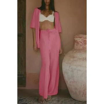 Show more Stay chic and stylish this summer with the Imily Bela Women's Summer 2 Piece Swimsuit Cover-up Set. This fashionable ensemble features a beautiful hollow-out knit cardigan top that adds a touch of elegance, paired perfectly with drawstring wide-leg long pants that offer comfort and versatility. Crafted from lightweight and breathable fabric, this cover-up set is designed to keep you cool and comfortable all day long, whether you are at the beach, by the pool, or enjoying a summer getaway. The unique crochet knit design not only enhances your beach look but also ensures you stand out in any crowd.