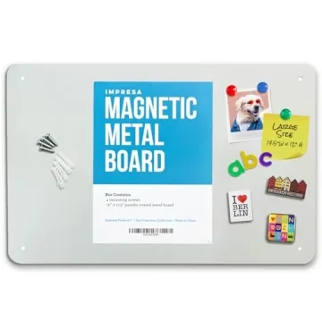 Show more Discover the perfect fusion of functionality and style with the Impresa Magnet Display Board. This medium-sized metal memo board is designed with versatility in mind, making it an ideal addition to any wall in your home, office, or classroom. Measuring 17.5 x 12 inches and featuring a robust thickness of 1.5mm, this board offers a durable and reliable surface for displaying your favorite photos, essential notes, shopping lists, and a plethora of other items. Its clean silver finish is not only aesthetically pleasing but also blends seamlessly with various decors, enhancing your space while providing an organized area for all your magnetic trinkets.