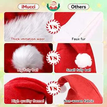 When compared to other Christmas hats on the market, the iMucci Long Santa Claus Hat stands out due to its extra length, premium materials, and comfort-focused design. Many standard hats lack the plush lining that ensures all-day wearability, while the unique aesthetic of our hat caters to those looking for more than just a basic accessory. Its versatility in use—from being a fun accessory to a decorative item—gives it an edge over competitors who often focus solely on functionality.
