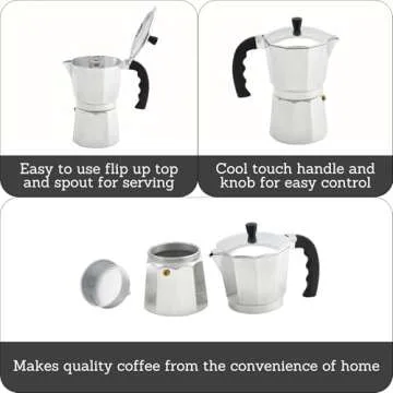 Experience the delightful aroma and rich flavor of authentic espresso brewed right at home with the IMUSA 6-Cup Moka Pot. This expertly crafted coffee maker combines durability with efficiency, featuring a heavy cast aluminum body that maintains the perfect temperature to keep your coffee warm for longer. The compact size is perfect for those with small kitchens or anyone who wants to enjoy coffee on the go, making it an essential addition to your kitchen arsenal. With a 6-cup capacity,...