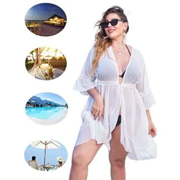 Elevate your summer wardrobe with the IN'VOLAND Plus Size Swimsuit Cover Ups, a blend of elegance and effortless style designed especially for women who appreciate comfort and fashion. Made from lightweight and breathable chiffon fabric, this kimono cardigan offers a soft touch against the skin, making it perfect for relaxed days by the beach or lounging poolside. The ruffle sleeve design and 3/4 sleeve length add a chic touch, ensuring you...