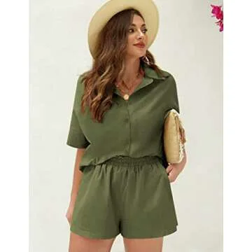The attention to detail in the design sets this outfit apart. The short sleeve button-down blouse features a charming round hem and a trendy turn-down collar, perfectly paired with high elastic waist shorts that offer both comfort and style. These shorts include handy side slash pockets, making it easy to carry essentials while on the go. Whether lounging at home or heading out for a day of adventures, this outfit promises to deliver elegance and relaxation in equal measure.