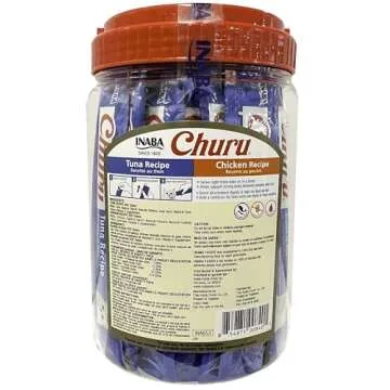 INABA Churu Cat Treats, Grain-Free, Lickable, Squeezable Creamy Purée Cat Treat/Topper, 25 Tuna & 25 Chicken
