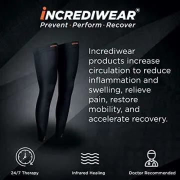 Show more Experience unparalleled support with Incrediwear's innovative leg sleeves, specifically designed to alleviate discomfort and enhance recovery for individuals of all activity levels. Unlike traditional compression gear, these leg sleeves utilize advanced heat-activated semiconductors to emit infrared waves that naturally improve blood circulation and minimize swelling. With proven effectiveness for both acute injuries and chronic conditions like osteoarthritis, Incrediwear's sleeves provide essential relief for your legs.