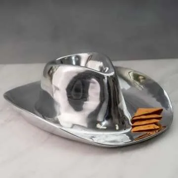 Show moreIntroducing the India Handicrafts 11114 Western Cowboy Hat Serving Tray, your ultimate companion for unforgettable gatherings and delicious feasts! Crafted from premium silver aluminum, this unique 16 x 16 x 6-inch tray not only serves as a practical kitchen accessory but also a striking centerpiece that sparks conversations. With its artistic cowboy hat shape, it celebrates the rustic charm of the West while ensuring your fruits, veggies, chips, and dips shine in style.