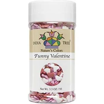 Show more Add a touch of magic to your baked creations with the India Tree Nature's Colors Funny Valentine Decoratifs Jar. This delightful jar, filled with vibrant and colorful heart-shaped sprinkles, is perfect for celebrating love any day of the year. Made with vegetable colorants and devoid of artificial dyes, these sprinkles offer a natural way to enhance your culinary delights. Whether you're decorating a cake, cookies, or cupcakes, these adorable sprinkles will bring a smile to anyone's face and make your treats stand out in both taste and appearance.