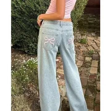 Indie Aesthetics Jeans for Women Gothic Punk Wide Leg Long Length Denim Pants Y2k Loose Casual Jeans Streetwear (Blue & Pink Bow, S)