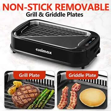 Indoor Grill, CUSIMAX Smokeless Grill Indoor, 1500W Electric Grill Griddle Korean BBQ Grill with LED Smart Display & Tempered Glass Lid, Non-stick Removable Grill Plate & Griddle Plate, Black