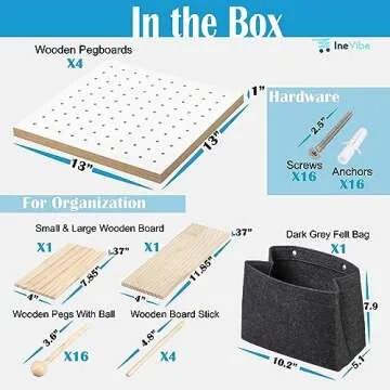 Show moreIntroducing the IneVibe Display Wall Organizer – the ultimate solution for organizing and showcasing your prized possessions! This beautifully crafted wooden pegboard set comprises four perfectly cut square boards, each measuring an impressive 13 x 13 inches, giving you the flexibility to arrange them as you desire. Whether you opt for a striking 2x2 configuration or a more artistic arrangement, the display spans a grand total of 26 x 26 inches, perfectly suited to brighten any wall while providing functional storage.