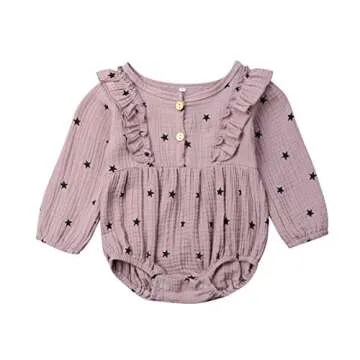 Infant Baby Girls Long Sleeve Romper Cotton Linen Bodysuit Ruffled Jumpsuit Newborn Autumn Outfit Clothes (0-3M, Purple/Star)