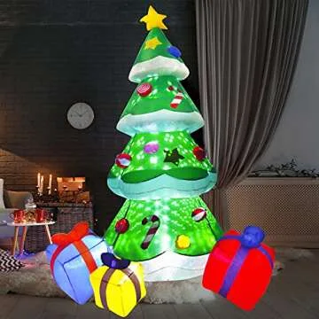 Show more Introducing the ultimate centerpiece for your holiday celebrations: our 7-foot inflatable Christmas tree! This stunning decoration is perfect for adding a touch of magic to your yard or event. With its bright, color-rotating LED lights, this inflatable tree comes to life, creating an enchanting atmosphere that will certainly delight your family and neighbors alike.