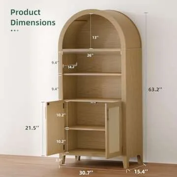 infurnic 63” Arched Storage Cabinet with Rattan Door, 5-Tier Arched Bookcase, Farmhouse Kitchen Pantry with Storage – Perfect for Dining Room, Living Room, Kitchen, or Home Office