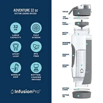 Show moreIntroducing the Infusion Pro 32 oz Fruit Infuser Water Bottle, an innovative hydration solution that blends sustainability with style! Crafted from premium BPA-free Tritan plastic, this durable, eco-friendly water bottle is designed to not only quench your thirst but also infuse your water with delightful flavors from fruits, herbs, and edible flowers. Its unique bottom-loading infuser design allows for maximum flavor extraction, letting your favorite ingredients steep from the bottom of the bottle for a refreshing drink that lasts all day. With an insulated neoprene sleeve that keeps your water cold while reducing condensation, this water bottle merges functionality with aesthetic appeal, making it the perfect companion for any activity.