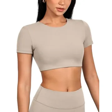 INGIA Women's Crew Neck Short Sleeve Crop Top - Comfortable Padded Yoga Shirt