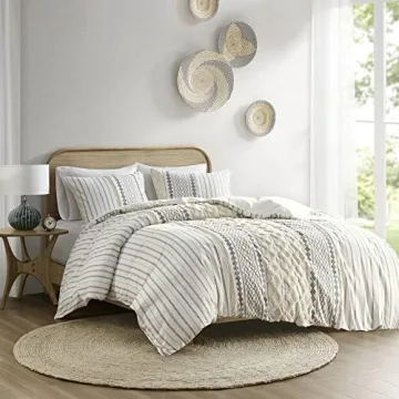 Show more Transform your bedroom into a serene sanctuary with the INK+IVY Imani 100% Cotton Duvet Cover Set. This exquisite bedding set boasts a striking mid-century modern design that combines elegance and comfort effortlessly. The duvet cover, crafted entirely from soft ivory cotton, is adorned with elegant geometric prints and tufted chenille accents that lend an air of sophistication and warmth. Measuring a generous 104 inches by 92 inches, it’s perfectly sized for king and California king beds, ensuring every inch of your bedding exudes quality and style.