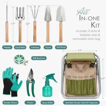 Show more The ultimate gardening companion has arrived! Our premium Garden Tools Set is designed for both novice gardeners and seasoned green thumbs. This comprehensive set includes everything you need to enhance your gardening experience: a trowel, weeder, transplanter, rake, cultivator, pruning shears, a plastic garden sprayer, and a pair of durable rubber gloves with polyester lining. Packaged in a convenient removable tote bag, the ensemble also features a 98ft binding line and a foldable seat, making gardening more enjoyable and less strenuous.