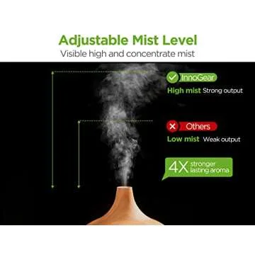 Show more The InnoGear Aroma Diffuser is a beautifully designed essential oil diffuser that combines function with modern aesthetics, making it a perfect addition for any home or workspace. With a generous 400ml water tank, this diffuser ensures you enjoy continuous moisture and fragrance without the hassle of frequent refills. Its unique Optional Runtime & Mist Mode allows you to choose between continuous output or pre-set timer settings of 1H, 3H, and 6H, making it incredibly versatile for different needs. Once the timer runs out or the water is depleted, the unit automatically shuts off, providing peace of mind without the fear of overheating.