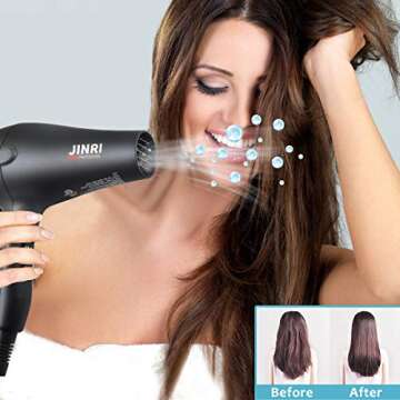 INRI 1875W Negative Ions Salon Hair Dryer, Professional DC Motor Air Blower with Concentrator & Diffuser, 3 Heat 2 Speed with Cool Shot Button, Light Weight Low Noise Hair Blow Dryers, Black