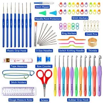 The set includes scissors, stitch markers, knitting markers, and sewing needles, providing everything you need for your crocheting projects.
