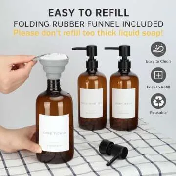 Show more The Premium Shower Soap Dispenser Set of 3 redefines how we perceive bathroom organization. Crafted from high-quality plastic, these durable and refillable bottles not only look elegant but also serve practical needs, making them a popular choice among high-end hotels. The set includes three 21-ounce bottles, perfectly sized to hold your favorite liquid soaps, shampoos, and conditioners. The thoughtful design ensures that your bathroom will showcase a clean, professional look, eliminating the clutter of mismatched bottles. Furthermore, each set comes with a practical silicone funnel for effortless refilling, and all pumps are smooth and easy to operate. With 9 different waterproof labels, users can customize their dispensers, maintaining both style and functionality while keeping the labels safe from moisture.