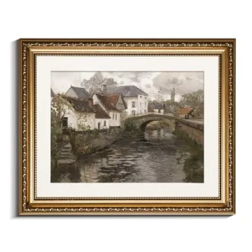 InSimSea Retro Gold Framed Wall Art, Home Room Riverside Small Town Vintage Wall Decor, Canvas Print Artwork, Farmhouse Country Decor, Antique Picture Frame Landscape Paintings, 13x16 Inch