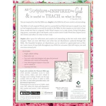 The Inspire Bible NLT offers ample margin space and stunning illustrations, making it ideal for Bible journaling enthusiasts. Users can easily personalize their journey with notes, sketches, or coloring, as the specially designed pages support various art mediums without bleeding through. The watercolor-friendly paper allows for easy blending, ensuring every stroke enhances the experience rather than detracts from it.