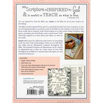 When placed alongside other devotional and journaling bibles, the Inspire Bible NLT stands out due to its vibrant designs and versatile functionality. Many competing bibles offer note-taking margins, but few combine this with such a variety of coloring opportunities. While other versions may cater more strictly to textual analysis, this bible embraces creativity, making it more appealing to those who see their spiritual life as a form of art. Its modern-day language and approachable format further enhance its desirability compared to traditional versions that can feel archaic and distant.