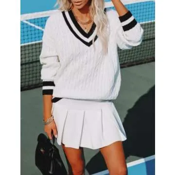 InterNos Women's Casual V Neck Long Sleeve Sweater Trendy Striped Pullover Cable Knit Preppy Sweaters(0132-White-S)