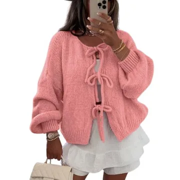 InterNos Women's Bow Tie Front Sweater Cardigan - Y2K Chunky Knit Outwear Coat (Pink)